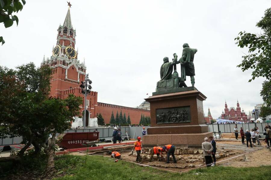 Первоначально около монумента будут проведены археологические исследования: памятник уже обнесли забором, рядом с ним аккуратно снимают брусчатку. Сейчас под современной брусчаткой обнаружили часть мостовой — специалисты выясняют, к какой эпохе она относится.