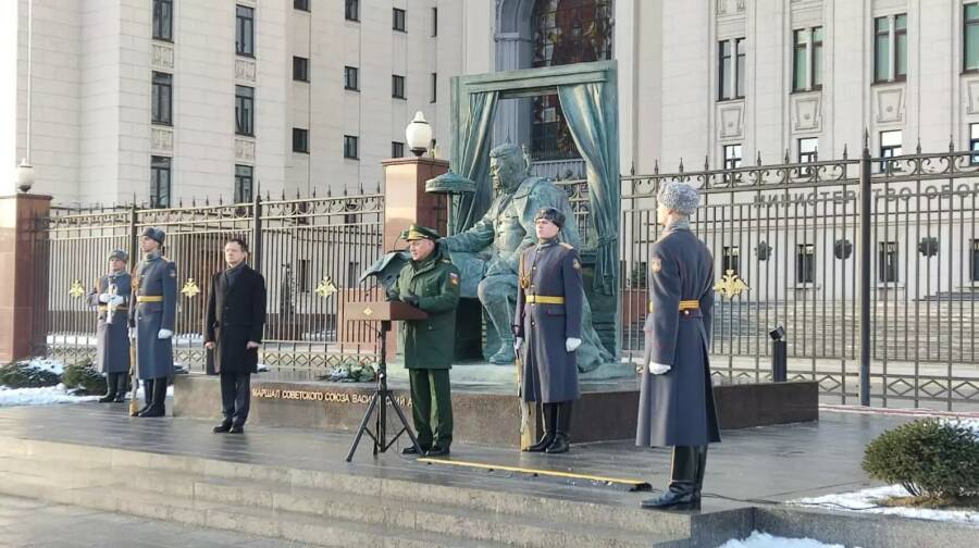 4 декабря в Москве у здания Министерства обороны на Фрунзенской набережной прошло торжественное открытие памятника Маршалу Советского Союза Александру Михайловичу Василевскому. На церемонии открытия выступили Министр обороны Сергей Шойгу и помощник Президента РФ, Председатель РВИО Владимир Мединский.