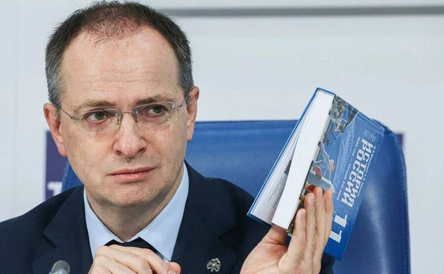 Владимир Мединский на презентации нового единого учебника по всеобщей истории и истории России для 10-х и 11-х классов, который будет использоваться в образовательном процессе с 1 сентября 2023 года .