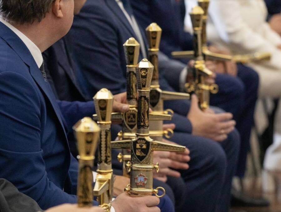 Мечи Победы уже были вручены 45 городам воинской славы из 29 регионов России, передает ТАСС. Клинки изготовили на Златоустовской оружейной компанией к 77-й годовщине Победы. Они переданы на вечное хранение городам, удостоенным указами президента Российской Федерации почетного звания "Город воинской славы".