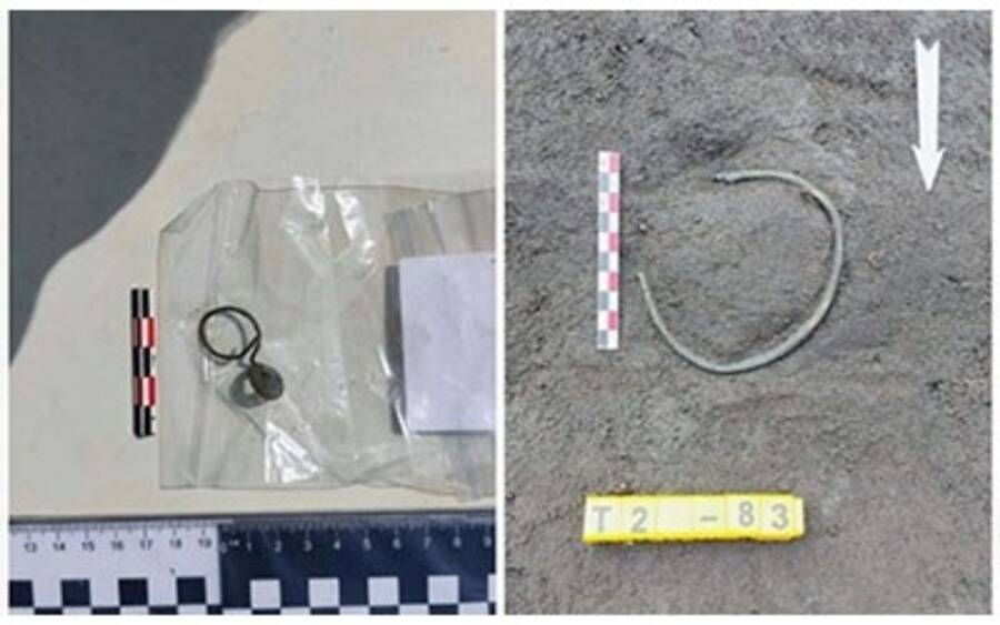 Кроме того, были обнаружены шейное украшение, бронзовая гривна и бронзовая спиралевидная сережка. Среди находок также оказались и кости человека: нижняя челюсть, несколько зубов и некоторые мелкие кости. Предполагается, что останки принадлежат взрослому и ребенку, передает «Омскрегион».