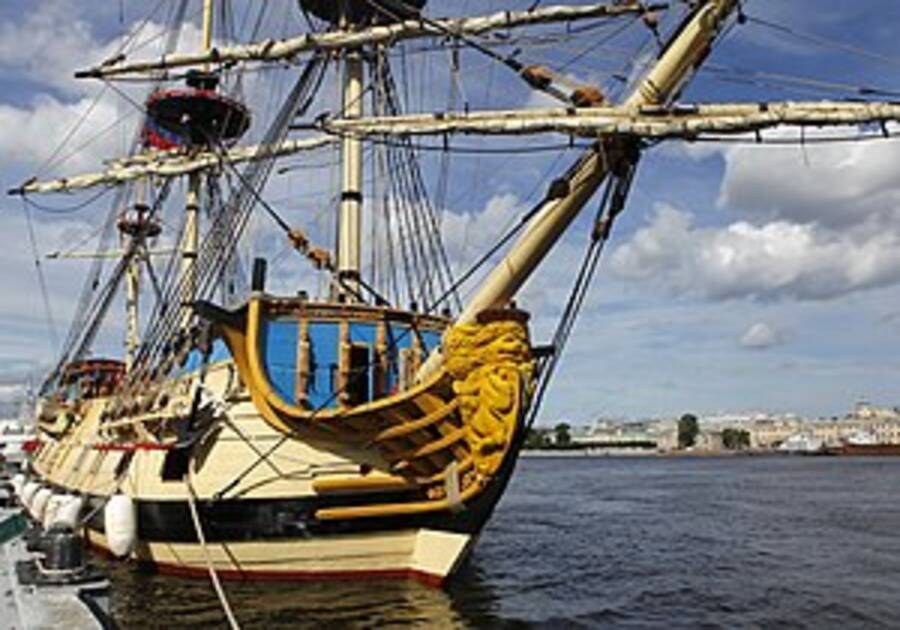 Кроме того, в честь 350летия со дня рождения первого русского императора на корабль была передана копия картины "Петр Первый на борту Полтавы", передает ТАСС.