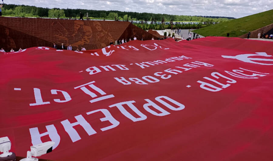 Возле Ржевского мемориала Советскому солдату развернули самую большую в мире копию Знамени Победы. Размеры полотна – 33 метра в ширину и 63 метра в длину, а его площадь составляет 2022 квадратных метра.