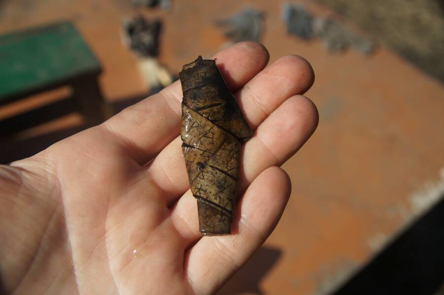 Другие, не менее интересные и редкие находки не заставили себя долго ждать. На раскопе обнаружили также кожаную деталь пращи (боевое ручное оружие для метания камней). Ученые отмечают, что эта находка довольно редка. Ранее фрагменты орудия находили в Тверском кремле и на нескольких раскопах в Великом Новгороде.