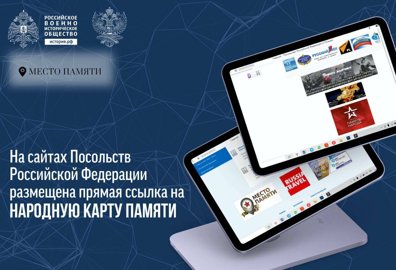 🔝 Прямая ссылка на электронную карту памятных мест размещена на порталах МИД России и Посольств Российской Федерации в зарубежных странах. Присоединиться к проекту можно на главных страницах представительств нашей страны. Для этого нужно найти специальный баннер с названием проекта.