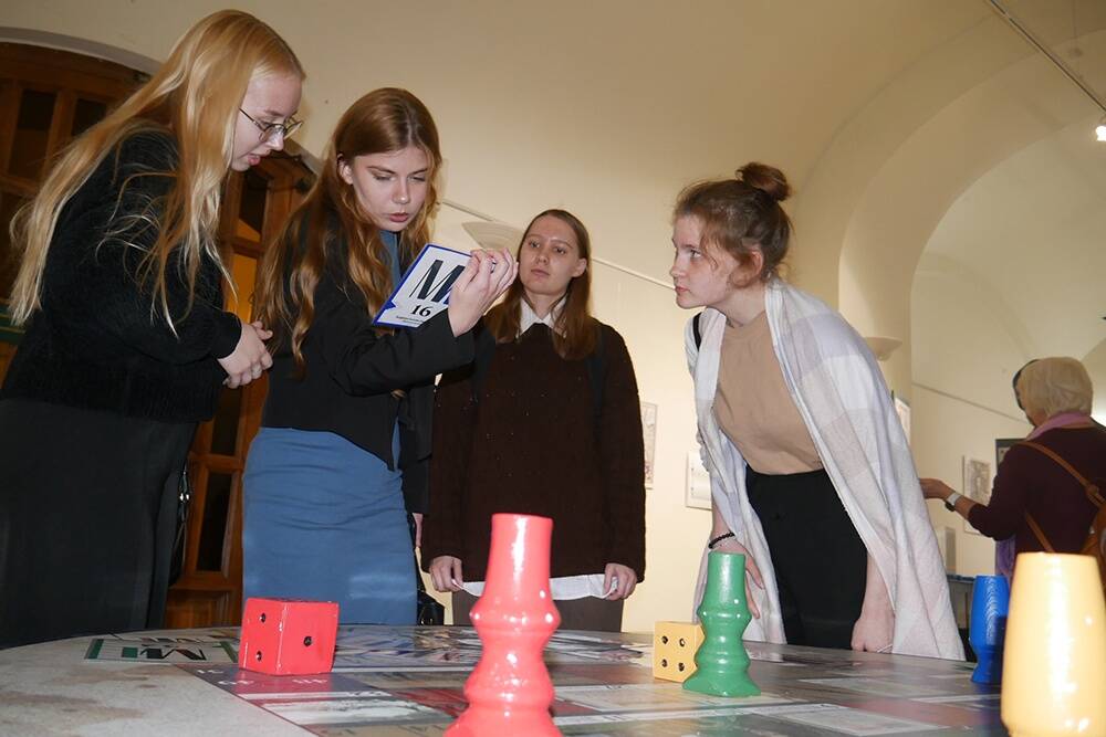 Петровскую эпоху на выставке можно изучать с помощью игры-«бродилки». На её поле есть пронумерованные клетки с заданиями, которые интересны и детям и взрослым. Так, в одном из заданий предлагают найти вставку с Адмиралтейской слободой и ответить на вопрос, успехам в какой войне способствовало развитие Адмиралтейской слободы.