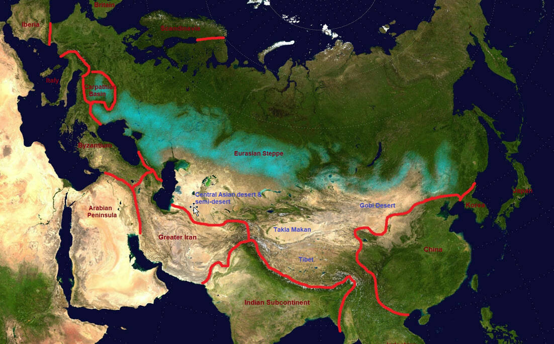 Как мы видели на карте1 выше, география поддерживает разделение Евразии по краям на множество «естественных геополитических образований», вдоль которых неоднократно формировались исторические государства. Прежде всего, различные острова и архипелаги имеют преимущество в виде четких границ (Британия, Ирландия, Япония, Филиппины, Индонезийский архипелаг и т. д.). Горные хребты и водоемы отграничивают и некоторые другие четко очерченные регионы, такие как Иберия, Италия, Скандинавия, Карпатский бассейн, Византия , охватывающая Балканский полуостров и Анатолию (прим.: Современная территория Румынии никогда не была составной частью Византийской или Османской империи, но географически является юго-западной частью Степи); Аравийский полуостров; Иранское плато/Великий Иран от Памира до Армении, обычно западная граница проходит по реке Евфрат, северная - по Сырдарье; Индийский субконтинент; Индокитай; Корея; и собственно Китай к востоку от Тибета и юго-востоку от пустыни Гоби до Ляонина (бассейн Восточно-Китайского моря, включая Желтое море).