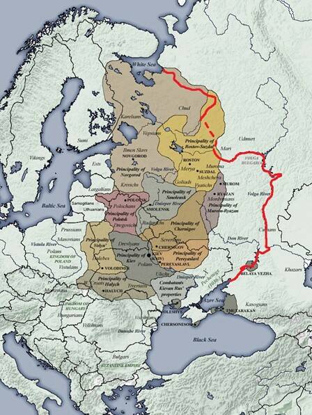 Восточная Европа (православные территории): На бывших территориях Киевской Руси мы сталкиваемся с аналогичной Балканам проблемой классификации государственности и институтов европейского типа. Великие князья Киевские после христианизации и учреждения Киевской митрополии в 988 г. управляли преимущественно децентрализованным государством в условиях постоянных войн и часто меняющихся границ с уралоязычными народами на севере/северо-востоке и тюркоязычными на юго-востоке. Они могли считатьсяде-юре подданными Византийской империи как в политическом, так и в религиозном плане.