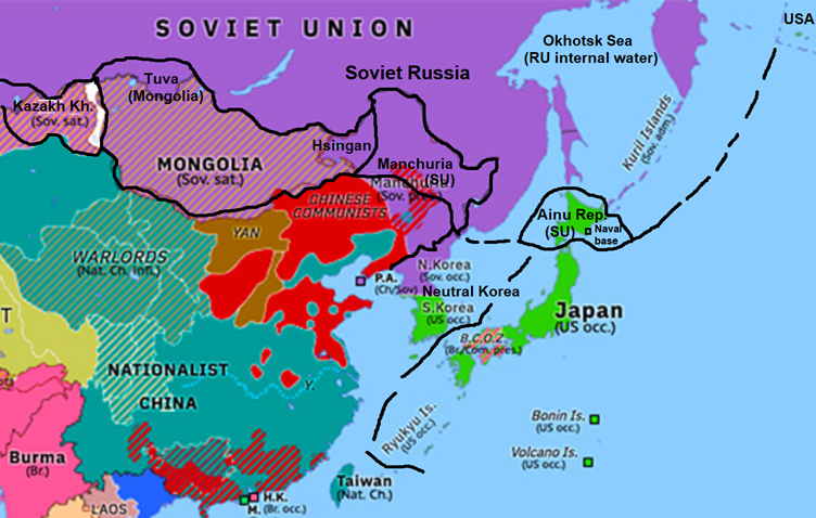 Что касается Японии, то советское руководство справедливо указывало на то, что оккупация Сахалина и Курильских островов не будет полностью безопасной без советского присутствия на Хоккайдо. Было бы разумнее обменять некоторые позиции в Восточной и Центральной Европе с США на временную оккупацию Хоккайдо и создание там айнского государства, репатриировав японское большинство (около 3 миллионов человек в 1945 г.) на Хонсю. Советская сателлитная Айнская республика могла бы выполнять роль буфера по отношению к Японии и "торгового узла" российского сырья и японских промышленных товаров, связывающего две державы на острове и обеспечивающего России незамерзающий военный порт в Тихом океане. Охотское море могло бы быть объявлено внутренним водоемом Советской России, что всегда было целью России с 1992 г. и частично достигнуто в 2014 г.