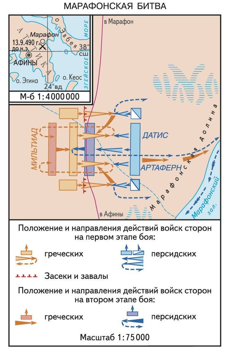 Но Каллимах с Мильтиадом понимали, что точка в сражении ещё не поставлена. Датис сохранил самые сильные войска, а значит, мог нанести удар по беззащитным Афинам. Поэтому хоронить павших и приносить жертвы богам было ещё рано. Греческие военачальники не ошиблись. Датис действительно решил захватить Афины. Но его флоту необходимо было преодолеть около сотни километров. По тем временам – расстояние значительное. У афинян было часов 10-15, чтобы добраться до своего города быстрее персов.