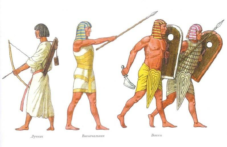 Древнейшее египетское воинство представляло собой общинное ополчение, собираемое фараоном по случаю похода. На вооружении воинов находились медные и каменные топоры, копья с кремниевыми наконечниками, кинжалы, булавы, обтянутые кожей деревянные щиты. В эпоху Среднего царства (XXI–XVIII вв. до н.э.) организация войска заметно усовершенствовалась. Появилось бронзовое оружие, мощный лук, создавались унифицированные отряды лучников и копейщиков. В этот период египтяне совершили походы в Палестину и отдаленные районы Нубии.