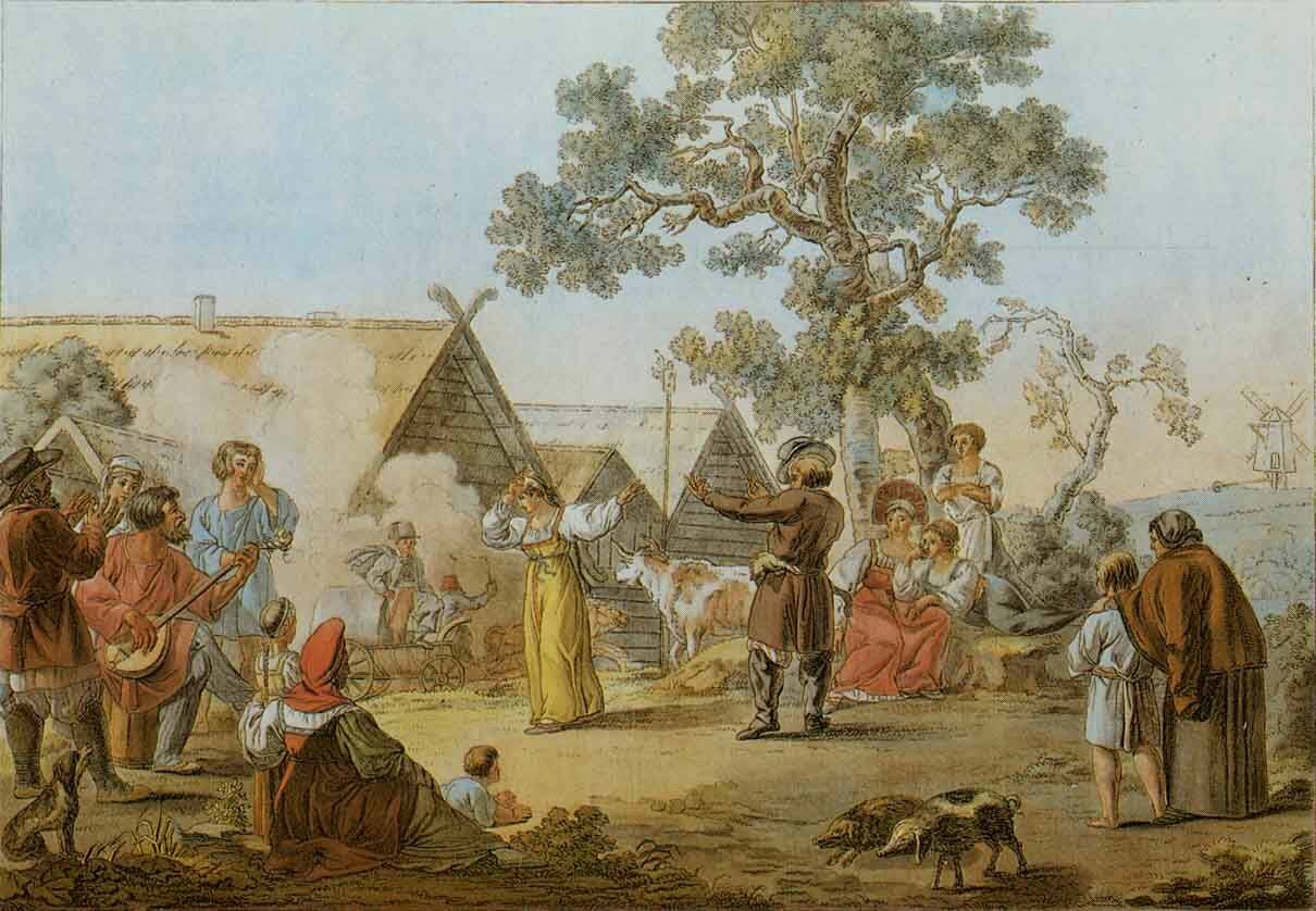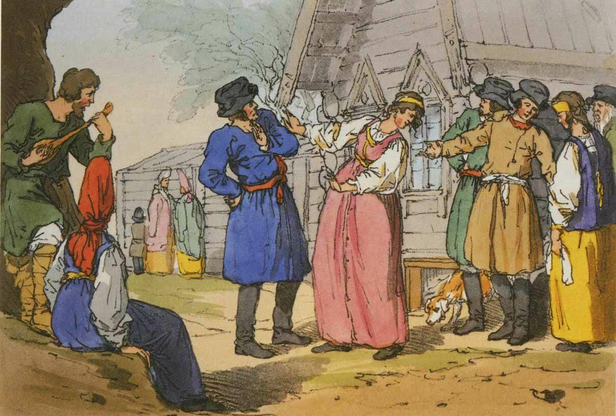 Русская пляска. Гравюра П.-Ш. Кокере по рисунку Е.М. Корнеева. 1812 год