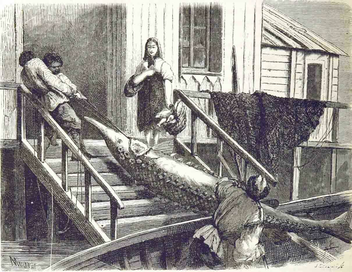 Осетр из Волги. Гравюра Ж.-П. Муане, спутника А. Дюма в путешествии по России