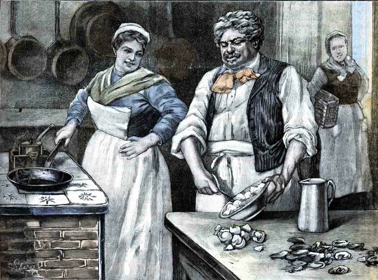 Александр Дюма готовит свой омлет с устрицами. Иллюстрация из французской газеты "Семейная кухня"