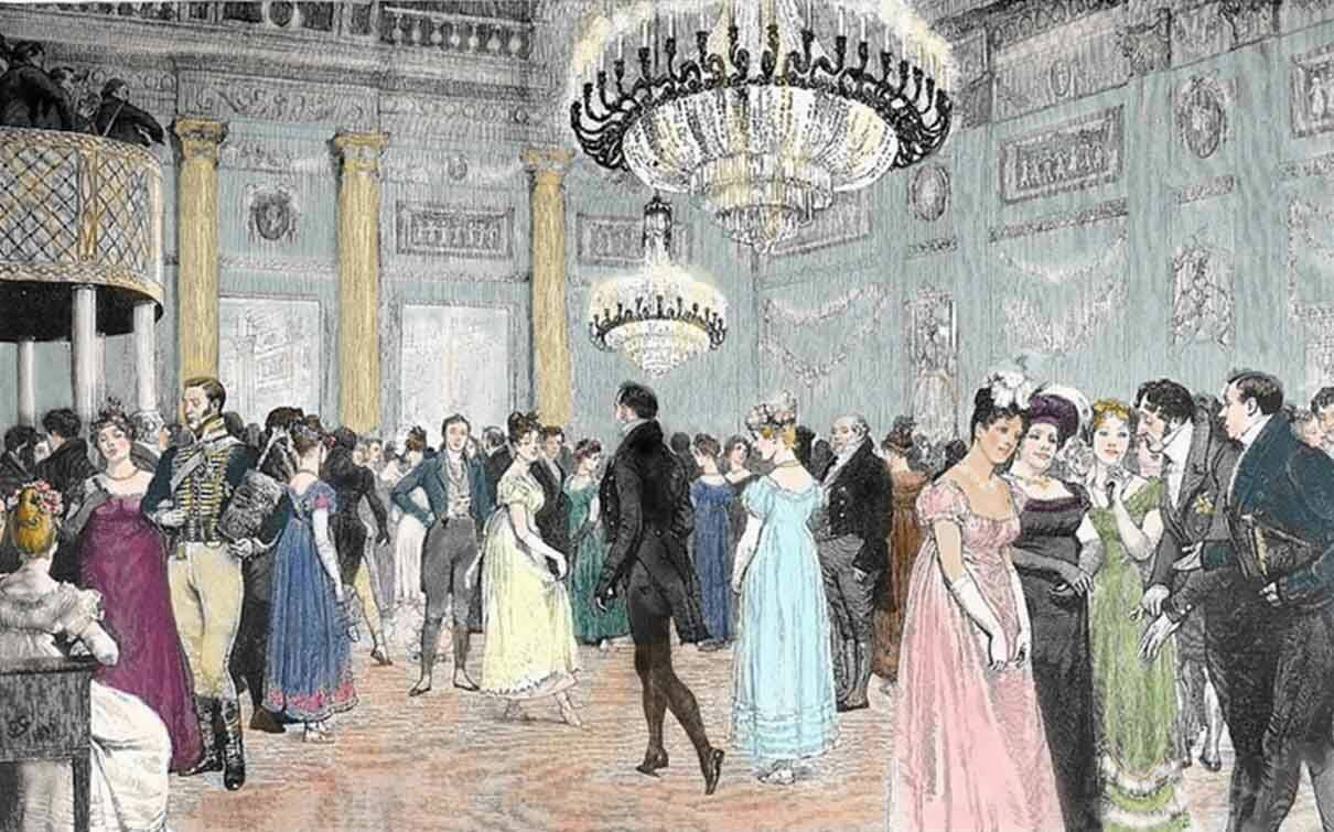 Вальс, ставший модным танцем со времен Венского конгресса, в Англии поначалу считался нескромным и воспринимался с большим подозрением, потому что в нем резко сокращалась дистанция между партнерами. Лорд Байрон считал вальс непристойным, но, с другой стороны, заявлял, что это единственный танец, который учит девушек думать. Галантный лорд, вероятно, имел в виду необходимость придерживаться такта и соблюдать шаги. Иным дамам вальс давался трудно, и по утрам во многих модных лондонских домах проводили уроки танцев, чтобы отработать фигуры вальса.