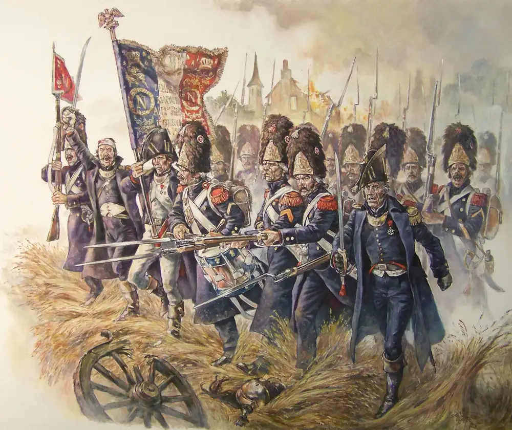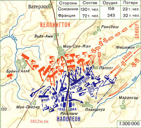 Многочисленные силы коалиции европейских монархий с разных сторон двинулись к границам Франции. Наполеон принял решение идти навстречу противнику в Бельгию. Его план заключался в том, чтобы не допустить соединения прусской армии Блюхера и англо-голландской армии под командованием Веллингтона, а, следуя своей испытанной тактике, разгромить их по отдельности. Вначале кампания развивалась успешно. 16 июня Ней атаковал англичан у Катр-Бра и нанес им поражение, но англичанам все же удалось уйти. В тот же день при Линьи Наполеон нанес тяжелое поражение войскам Блюхера и приказал маршалу Груши с 35 тысячами солдат их преследовать. Со своими главными силами Наполеон двинулся против Веллингтона, окопавшегося возле селения Ватерлоо. 18 июня началось это последнее сражение многолетней войны. Веллингтона, с его, как говорили, «бульдожьей хваткой», трудно было выбить с занятых им позиций, но французы уже повсеместно брали верх и почти достигли победы, когда вдруг на правом фланге показалась быстро надвигавшаяся масса солдат.