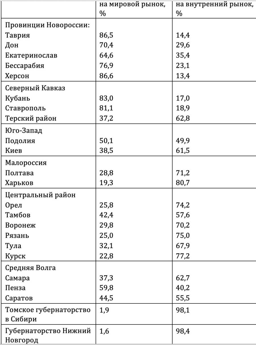 Эти цифры помогают нам понять, что регионы с наилучшими транспортными возможностями для мирового рынка, то есть Новороссия и Северный Кавказ на Черном море, почти все свои излишки без остатка направляли на экспорт. Значительными также были излишки в волжском регионе, и по рекам и Балтийскому морю также доставлялись на мировой рынок. Напротив, центральные регионы и, в особенности, далеко расположенные регионы Сибири поставляли свои излишки в соседние области-получатели.