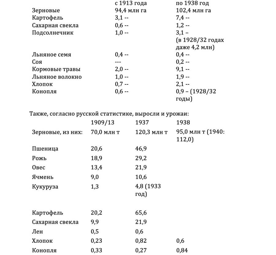 4) Наконец, решающую роль при сравнении объемов урожая мирного времени играет тот факт, что ранняя статистика, как и в Европе, исходила из «фактического сбора», в то время как нынешние оценки — это оценки урожая «на стебле», так называемые «биологические» оценки. То есть в этих современных данных не учитываются обычные потери при сборе. Таким образом, сегодняшние цифры, несомненно, завышены.