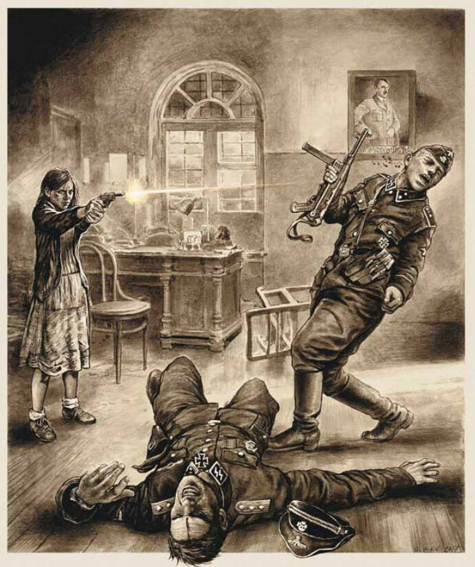И Михасик выполнил это обещание до конца. Он встал у дороги с гранатой, спрятанной в кармане. Он ждал. Увидел проезжающую мимо машину с немецкими офицерами. В одном из них Михасик признал убийцу своей семьи. Взрывом гранаты все офицеры в машине были убиты, а сам молодой патриот был ранен. Немецкие солдаты добили раненого мальчика штыками.