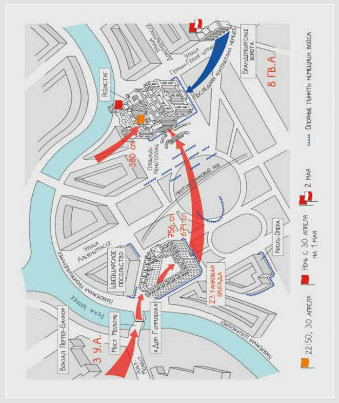 После взятия рейхстага и имперской канцелярии почти весь центр оказался в руках наших войск. В 6 часов утра 2 мая генерал Вейдлинг, командующий обороной Берлина, в сопровождении трёх немецких генералов перешёл линию фронта и сдался в плен. Через час, находясь в штабе 8-й гвардейской армии, он написал приказ о капитуляции: «30 апреля фюрер покончил с со‑ бой, и, таким образом, оставил нас, присягавших ему на верность, одних. Приказываю немедленно прекратить сопротивление».