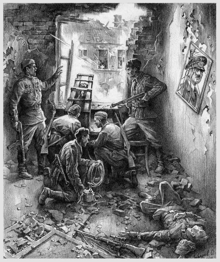 …Одиночные выстрелы раздавались и с верхнего этажа, но особенно ин‑ тенсивный огонь гитлеровцы вели из помещений первого этажа и подвала. Но в проломы и уже выбитые двери вливались в здание все новые и новые группы наших бойцов. Они теснили фашистов, освобождая одну за другой комнаты и залы имперской канцелярии.