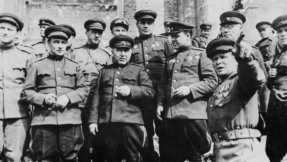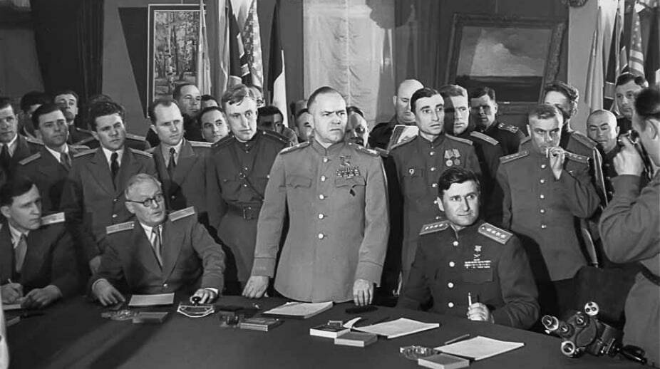 Советская делегация во главе с маршалом Жуковым на церемонии подписания акта о безоговорочной капитуляции нацистской Германии.
