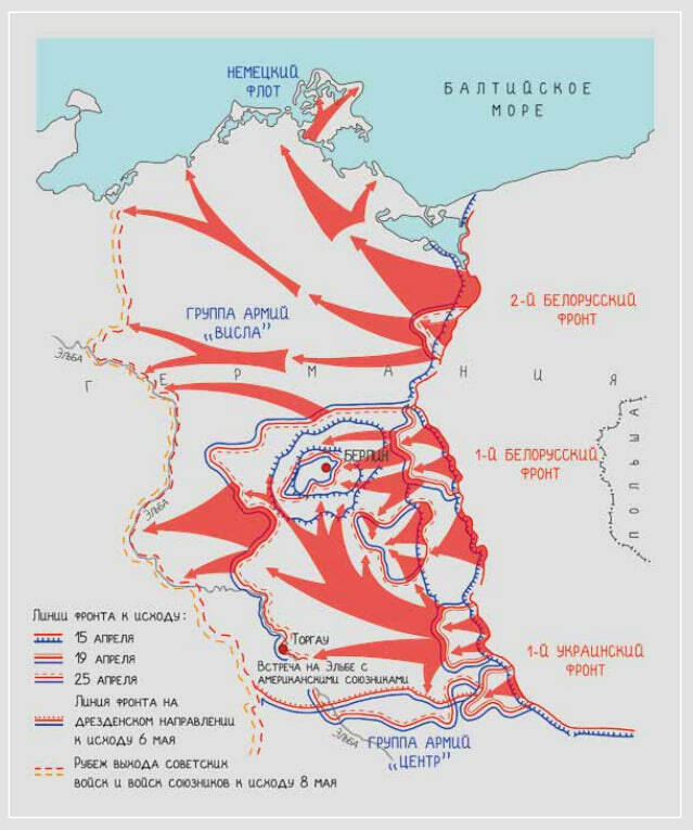 Настало время уничтожить нацизм в его логове и закончить войну Победой. Бойцы и военачальники вспоминали тяжелейший 1941 год, битву за Москву, когда немцы стояли на пороге нашей столицы. Теперь ситуация поменялась на противоположную. Наша армия стояла на пороге Берлина. Сил, чтобы остановить наше наступление и затем разгромить наши войска, у Германии уже не было. Кто-то из наших бойцов пошутил: «Не могут немцы говорить, как мы говорили под Москвой — отступать некуда, позади Берлин. Мы не дадим им отступить в Берлин!»