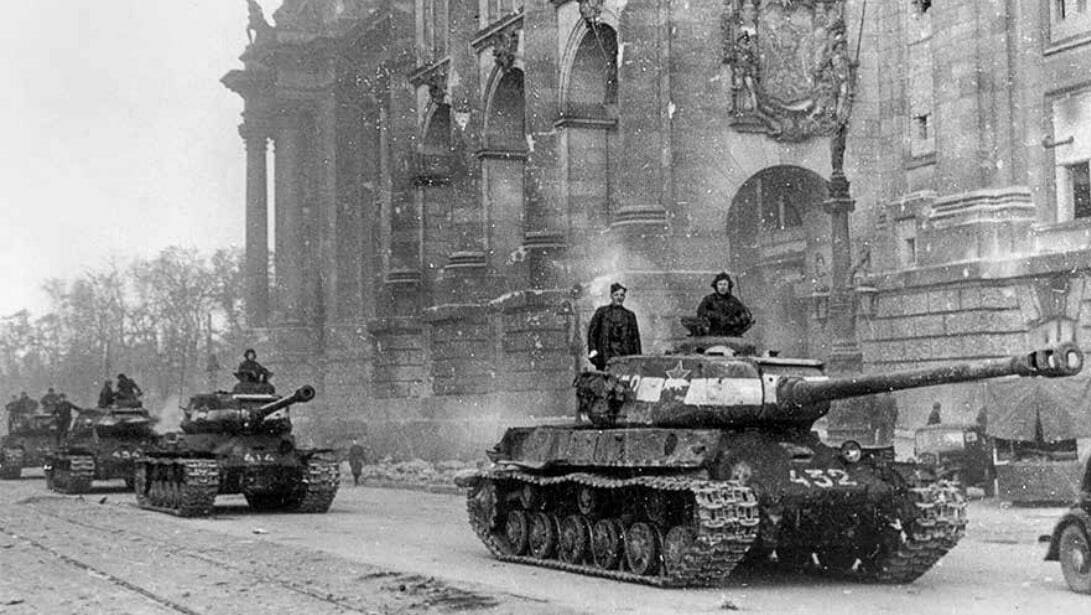 Колонна советских танков ИС-2 из 7-й гвардейской танковой бригады. Эмблема — белый медведь со звездой —указывает на то, что бригада освобождала Советское Заполярье в 1944 году. Широкие белые полосы — опознавательные знаки для американской и британской авиации.