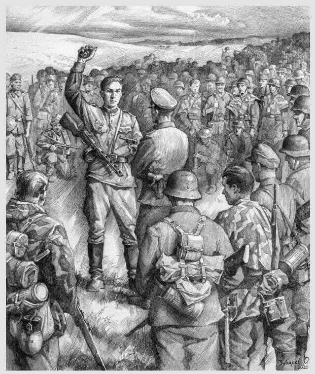 До атаки осталось минут 50. Насту‑ пила тишина, как перед бурей, — тре‑ вожная, напряжённая. И вдруг в этой тишине, нарушаемой лишь треском пожаров, послышался детский плач. Словно откуда‑то из‑под земли, глухо и призывно звучал голос ребёнка. Пла‑ ча, он повторял одно, понятное всем слово: «Муттер, муттер…»