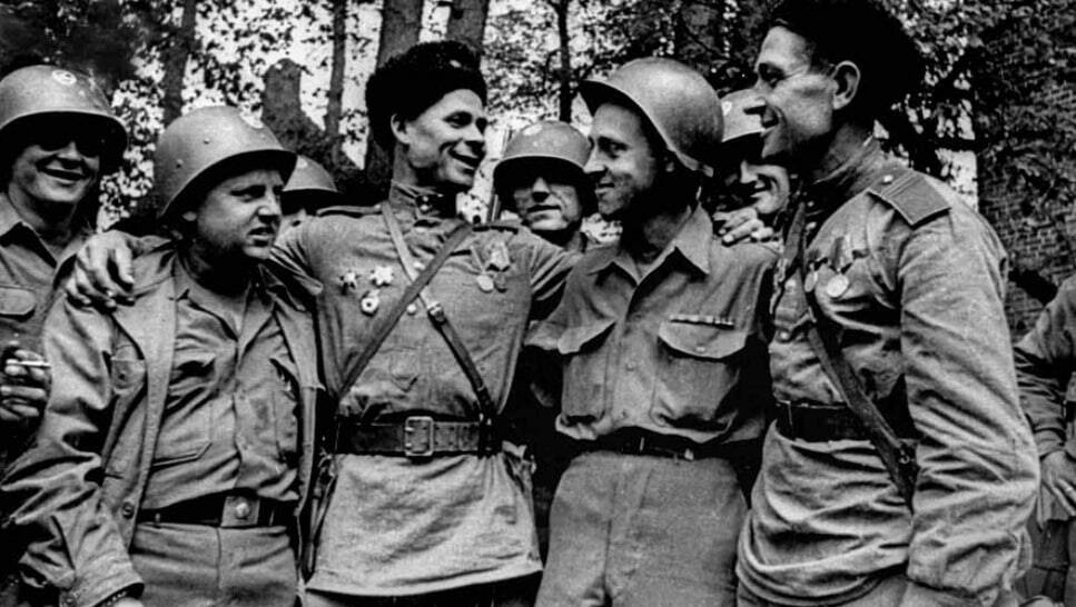 Советские кавалеристы и американские пехотинцы на реке Эльбе.