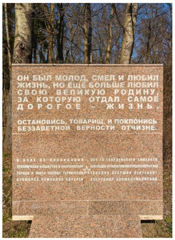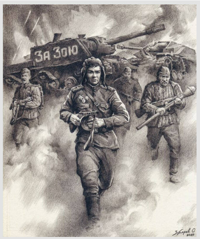 13 апреля 1945 года западнее Кёнигсберга разгорелся тяжёлый бой на шоссе Кёнигсберг — Пиллау в районе местечка Фирбрюдеркруг. Самоходчики 350-го гвардейского тяжёлого самоходного артиллерийского полка шли впереди наших войск как таран. Командиром батареи самоходок в этом полку был молодой офицер Александр Космодемьянский — младший брат Зои Космодемьянской, погибшей в битве за Москву (мы рассказывали о её подвиге в тетради «Медаль за оборону Москвы»). В 1943 году Александру исполнилось 18 лет, и он сразу пошёл в армию, чтобы отомстить нацистам за гибель своей сестры. Он выучился на офицера-танкиста и на башне своего танка КВ написал «За Зою». В бою он не боялся ничего, рвался вперёд, мстя за свою сестру. За мужество и отвагу в боях он был награждён орденами Отечественной войны II и I степени.