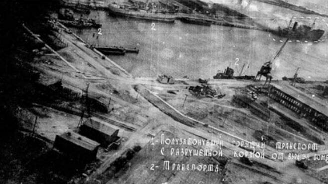 Фотоснимок порта Пиллау с боевого самолёта ВВС КБФ во время налёта.