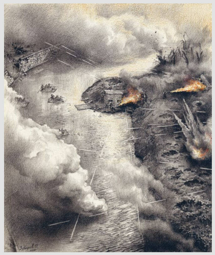 спускали на воду плотики, по форту открыли максимально интенсивный огонь наши артиллеристы, пулемётчики и все приданные огневые средства. Первыми переправлялись сапёры с зарядами взрывчатки и огнемётчики, вооружённые ранцевыми огнемётами. Сапёры подорвали амбразуры напольного капонира. В это же время бойцы, вооружённые ранцевыми огнемётами, атаковали немецкие пулемётные гнёзда на валу.