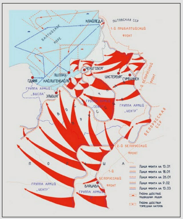 Эту замурованную крепость предстояло взломать. 14 января 1945 года войска 2-го Белорусского фронта маршала Рокоссовского нанесли удар из освобождённых районов Польши и уже к 26 января 1945 года вышли на берег Балтийского моря в городе Эльбинге. Восточная Пруссия превратилась в огромный район окружения. Сообщение с остальной Германией осталось только по морю.