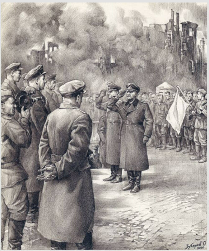 Капитуляция Кёнигсберга. Генерал Ляш отдаёт честь советским генералам.