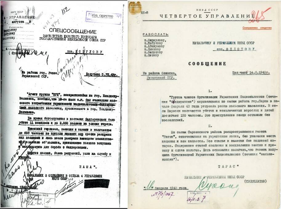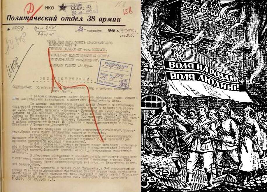 Слева: Донесение об активизации националистов и терактах против гражданских лиц. 1945 г., ЦАМО РФ Справа: Агитационный плакат украинских националистов 1940-е гг.