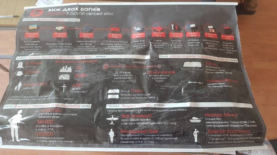 Одним из зрелищных элементов трофеев СВО стал внушительный плакат с рассказом об истинной истории «Второй свiтовой войны». Тут мы видим, что украинцы воевали с гитлеровской Германией не как часть большого и единого советского народа, а вопреки советскому народу.