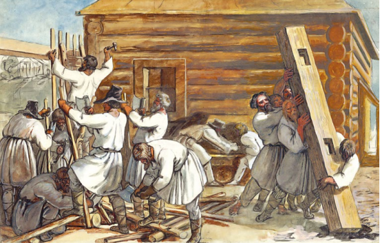 Русские крестьяне строят избу, картина Г. Оэри, ок. 1810
