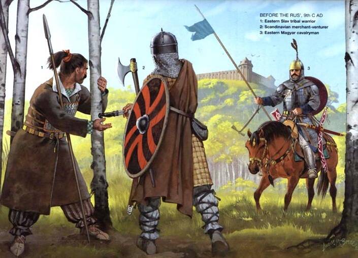 1. воин одного из восточно-славянских племен; 2 - варяг-наемник; 3 - мадьярский всадник. Худ. Ангус МакБрайд