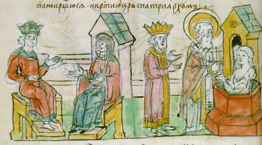 Крещение княгини Ольги в Царьграде. Миниатюра Радзивилловской летописи