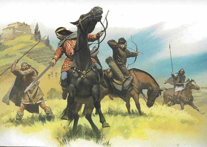 В течение IV-V веков на современном юге России господствовали многочисленные кочевые племена гуннов — это название господствует в европейских языках, тогда как в Азии, являющейся их родиной, их называют сюнну или хунну. Эти племена издревле кочевали в Центральной Монголии и Степном Забайкалье, доходя до Алтая, Южной и Западной Сибири. Кочевники были весьма воинственные, беспрестанно конфликтовали с соседями и не раз совершали грабительские нападения на Китай, который для обороны в том числе и от них выстроил знаменитую Великую стену. Временами кочевники до такой степени усиливали свои позиции, что даже китайцы были вынуждены платить её дань. Наконец, империя всё-таки смогла разгромить племена, лишив их исконных кочевий. Этнографы считают, что после этого они оказались разделены — южные племена попали в сферу влияния Китая, а северные были вынуждены уйти на запад, где смешались с тюркскими и ираноязычными племенами. Так появились гунны, которых знаем мы.