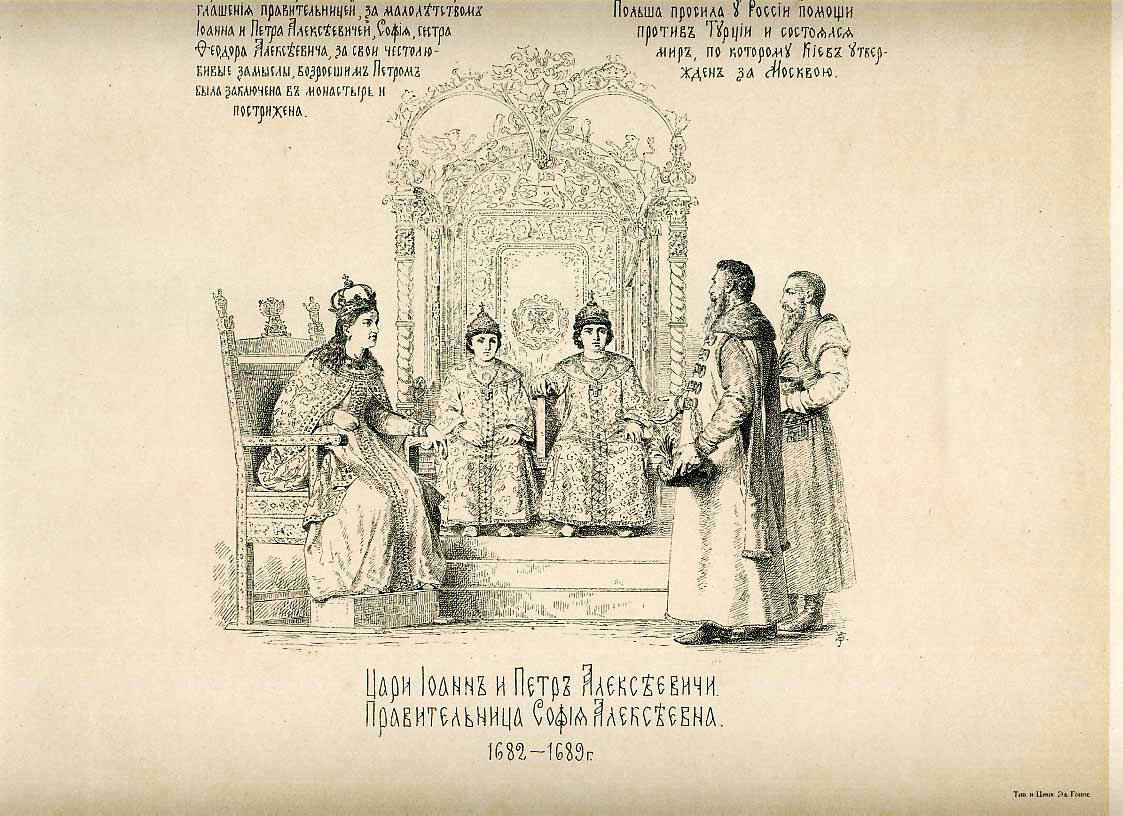 Стрельцы перестали бунтовать; но правительства не было […]. Правительством должны были овладеть люди, которые не прятались и не трепетали, а действовали, – Софья со своими сестрами и приверженцами. Царевны управляли Россиею! Софья выдвинулась сама собою на первый план, и никто ей не мешал: это было единственное лицо из царского дома, которое хотело управлять, и все волею-неволею обращалось к ней, к ней обращались и стрельцы со своими просьбами или требованиями, и, разумеется, Софья спешила удовлетворить их, раздала им деньги, сколько только можно было собрать, посулила вперед по 10 рублей на человека, согласилась дать им почетное название «надворной пехоты». […] Софья управляла на деле; но это управление надобно было освятить правом: Софья управляла во дворце, а в церквах поминали великого государя царя Петра Алексеевича. 23 мая Хованский донес царевнам, что стрельцы прислали выборных: все стрельцы и многие чины Московского государства хотят, чтоб царствовали оба брата вместе, в противном случае грозят опять приходить с оружием. Царевны послали за боярами, окольничими и думными людьми; те не захотели решить такого великого дела одни; созван был собор, […]. Решено: быть обоим братьям на престоле. Ударили в большой колокол, в Успенском соборе пели молебен и возгласили многолетие благочестивейшим царям Иоанну Алексеевичу и Петру Алексеевичу. Уже этим самым возглашением давалось первенство Иоанну перед Петром; но сочли за нужное выразить это еще определеннее, понизить Петра перед Иоанном, чтоб тем самым понизить царицу Наталью Кирилловну, отнять у нее возможность требовать себе правительства. Опять стрелецкие выборные явились с требованием, чтоб Иоанн был первым царем, а Петр вторым. Царевны объявили, что выборные говорят по внушению божию, и 26 мая дума вместе с патриархом и архиереями решила: Иоанну быть первым царем, а Петру вторым, что и объявлено стрельцам и всему народу. Стрельцов кормили во дворце, ежедневно по два полка, и 29 мая они объявили боярам, чтобы правительство, по молодости обоих государей, было вручено сестре их, царевне Софье Алексеевне. Началась обычная церемония: все стали упрашивать Софью принять правительство, та отказываться, наконец согласилась.