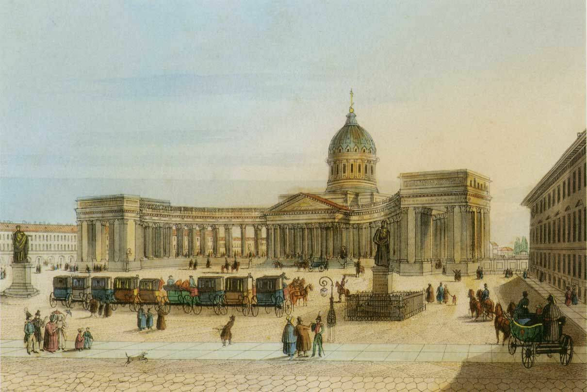 Казанский собор со статуями Кутузова и Барклая-де-Толли. 1837–1842 годы. Раскрашенная гравюра К.П. Беггрова