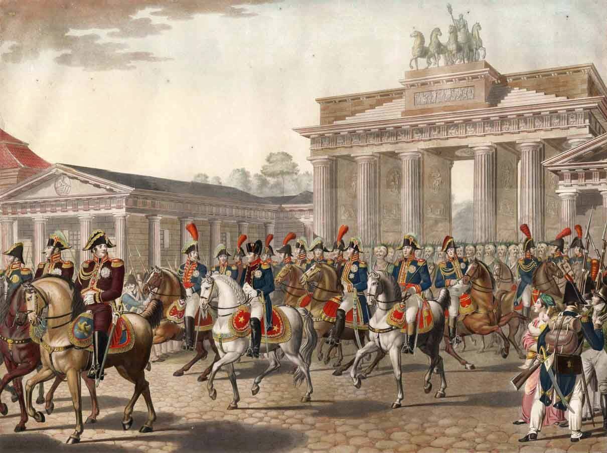 Наполеон и его армия победно вступают в Берлин 27 октября 1806 года. Раскрашенная гравюра XIX века