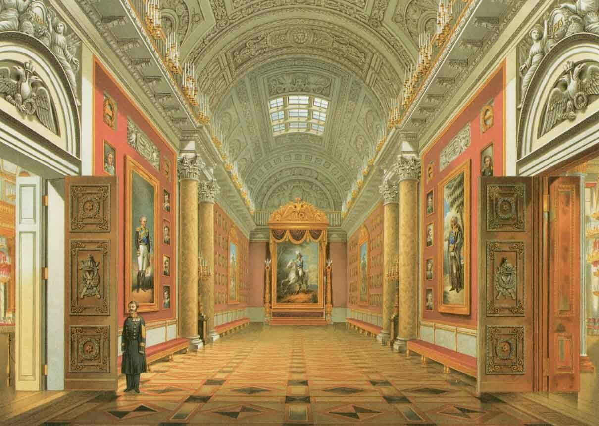 Уже спустя полгода после начала царствования Николай I занялся перестройкой Военной галереи 1812 года в Зимнем дворце, начало которой было положено еще при Александре I. Зал, в котором разместилась галерея, был спроектирован знаменитым архитектором Карлом Росси и строился с июня по ноябрь 1826 года. Он заменил несколько маленьких комнат в середине главного блока Зимнего дворца — между Белым залом и Большим Тронным залом, в нескольких шагах от дворцовой церкви. Торжественная церемония открытия галереи состоялась 25 декабря 1826 (6 января 1827) года.