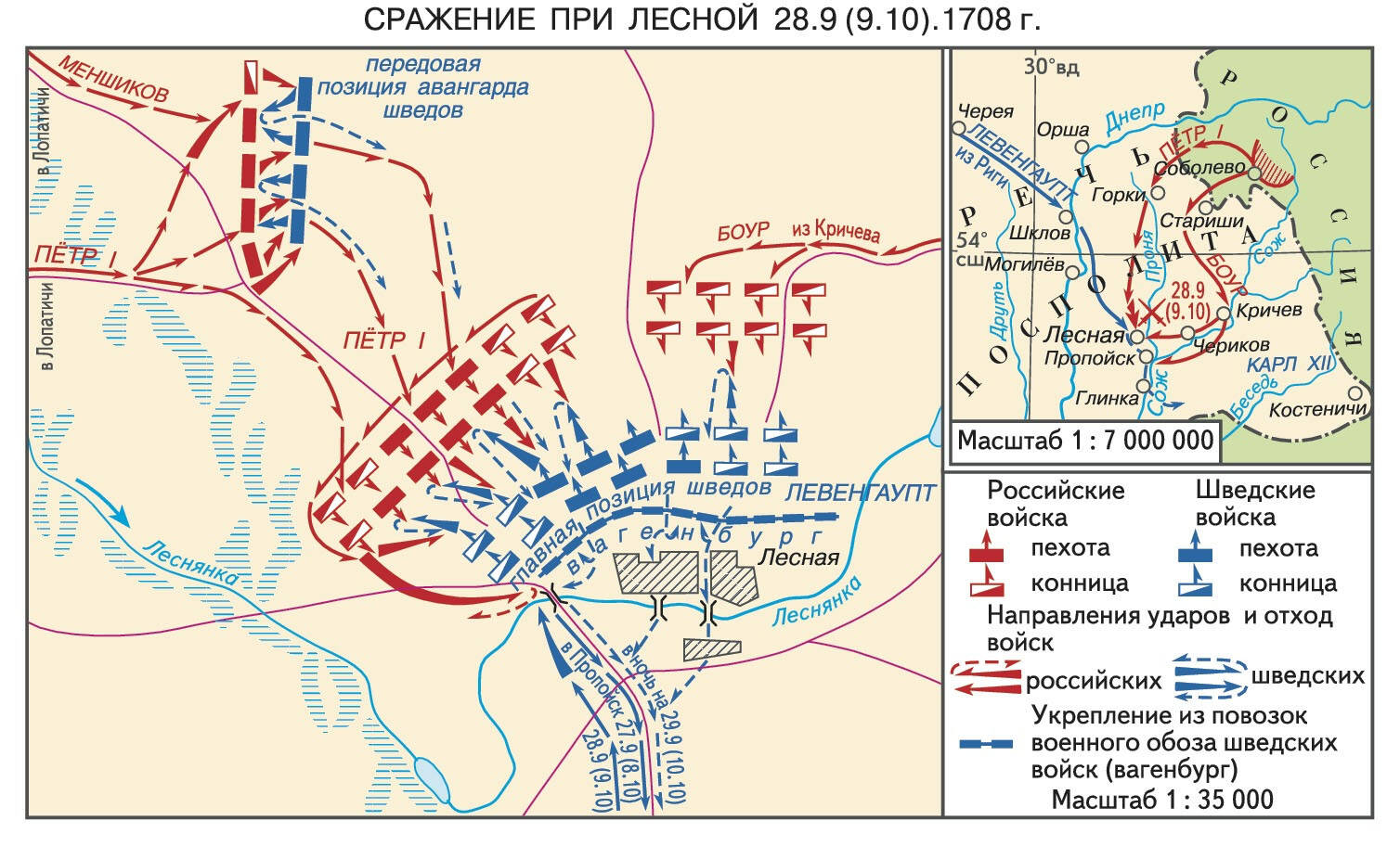 А по отправлении фелдмаршала Шереметева на Украйну, Его Величество, взяв свою гвардию и той дивизии пехоту конную и кавалерии 16 региментов под командою князя Меншикова, пошел в Литву, под Лесное, на встречу генерала неприятельского Левенгопта, которой шел в 16000 и имел при себе довольно муниции, провианту, и артиллерии; которой при том месте под Лесном разбит, и артиллерии 16 пушек, и богаж весь взят, и инфонтарию всю потерял, только кавалерии 5 или шесть полков бегом отвел и соединился с королем шведским.