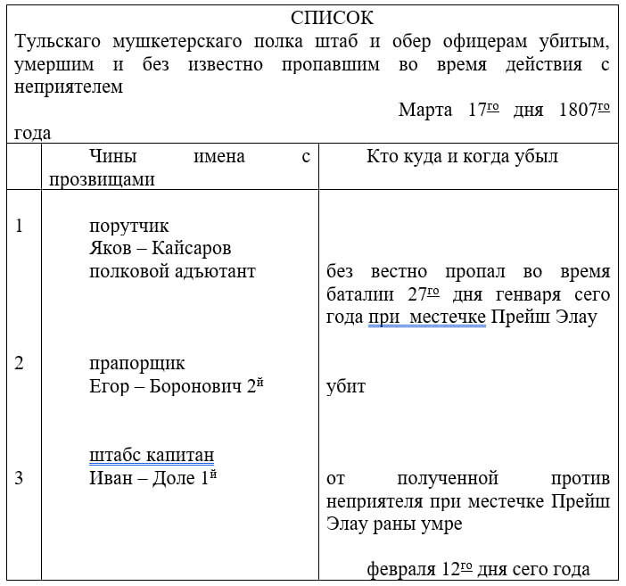 Высочайше в ввереннаго мне Подольскаго Мушкетерскаго полка во время бывшаго сражения с неприятельскими французскими войсками при местечке Прейш Ейлау прошлаго Генваря в 27й день на месте убиты прапорщик Васильев 1й, артиллерийской полуроты порутчик Кироль; так же тяжело раненый и от ран умерший капитан Хрипнов со стоят в полку невыключенными о чем ВАШЕМУ ИМПЕРАТОРСКОМУ ВЕЛИЧЕСТВУ доношу.