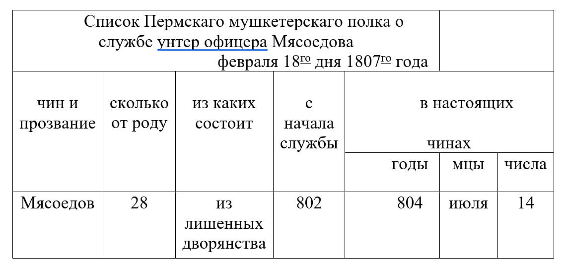 Генерал лейтенант Тучков 1й по поводу Донесения к нему шефа Пермскаго мушкетерскаго полка полковника Гарнаульта представляет мне, что того полка унтер офицер Мясоедов, бывший разжалован по ВСЕВЫСОЧАЙШЕЙ ВАШЕГО ИМПЕРАТОРСКАГО ВЕЛИЧЕСТВА конфирмации, за намерение деланию фальшивых ассигнаций из прапорщиков с лишением чина и дворянскаго достоинства в рядовые в 1801м году, и потом произведенный 804м июля 14го в унтер офицеры продолжая службу с рачительностию и усердием в бывшую 805го года компанию во время сражения был ранен в грудь почему по рекомендации штаб и обер офицеров находившихся в полку был представлен к награждению. Ныне же ведя себя он Мясоедов подобным образом по службе, и в бывшее при Прейш Елау минувшаго Генваря 27го числа сражение показал себя примерно храбрым, почему достойно заслуживает МОНАРШАГО ВАШЕГО ИМПЕРАТОРСКАГО ВЕЛИЧЕСТВА награждения. Причем приложил краткий о службе его список; о чем ВАШЕМУ ИМПЕРАТОРСКОМУ ВЕЛИЧЕСТВУ с послужным списком на ВЫСОЧАЙШЕЕ благоусмотрение всеподданнейше представляю.