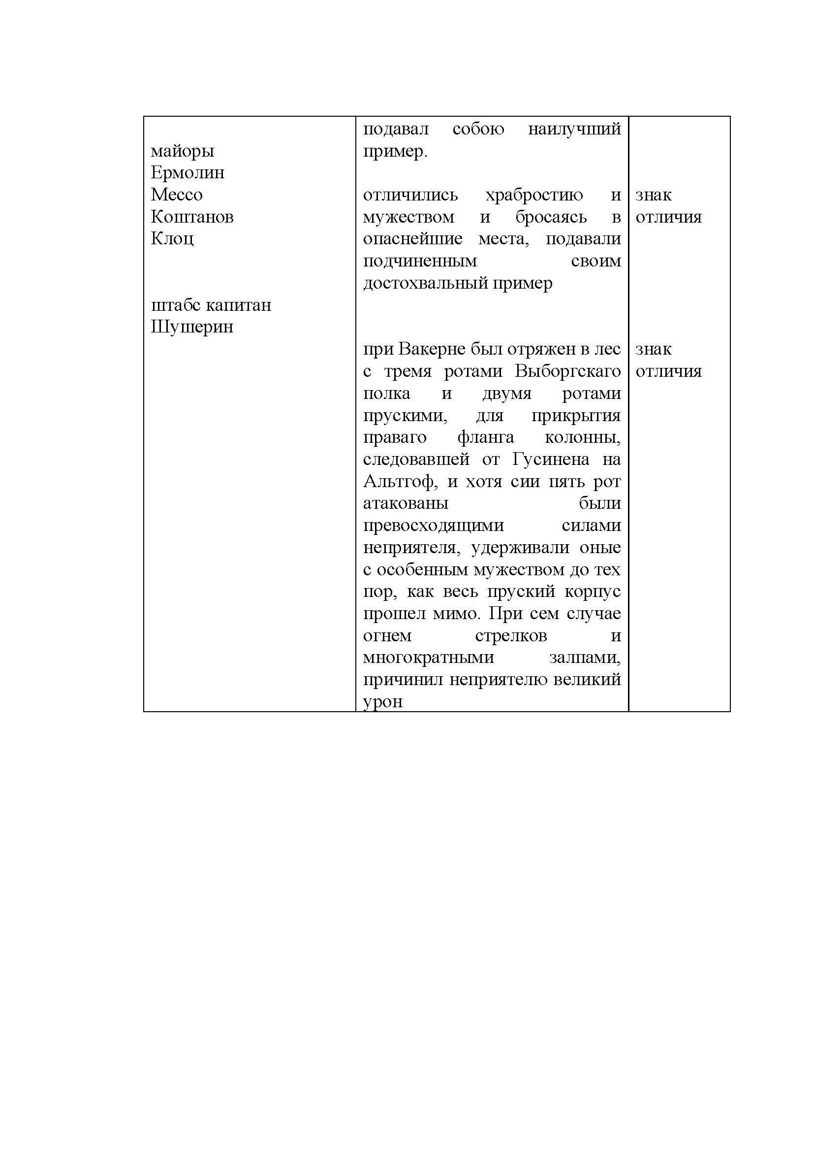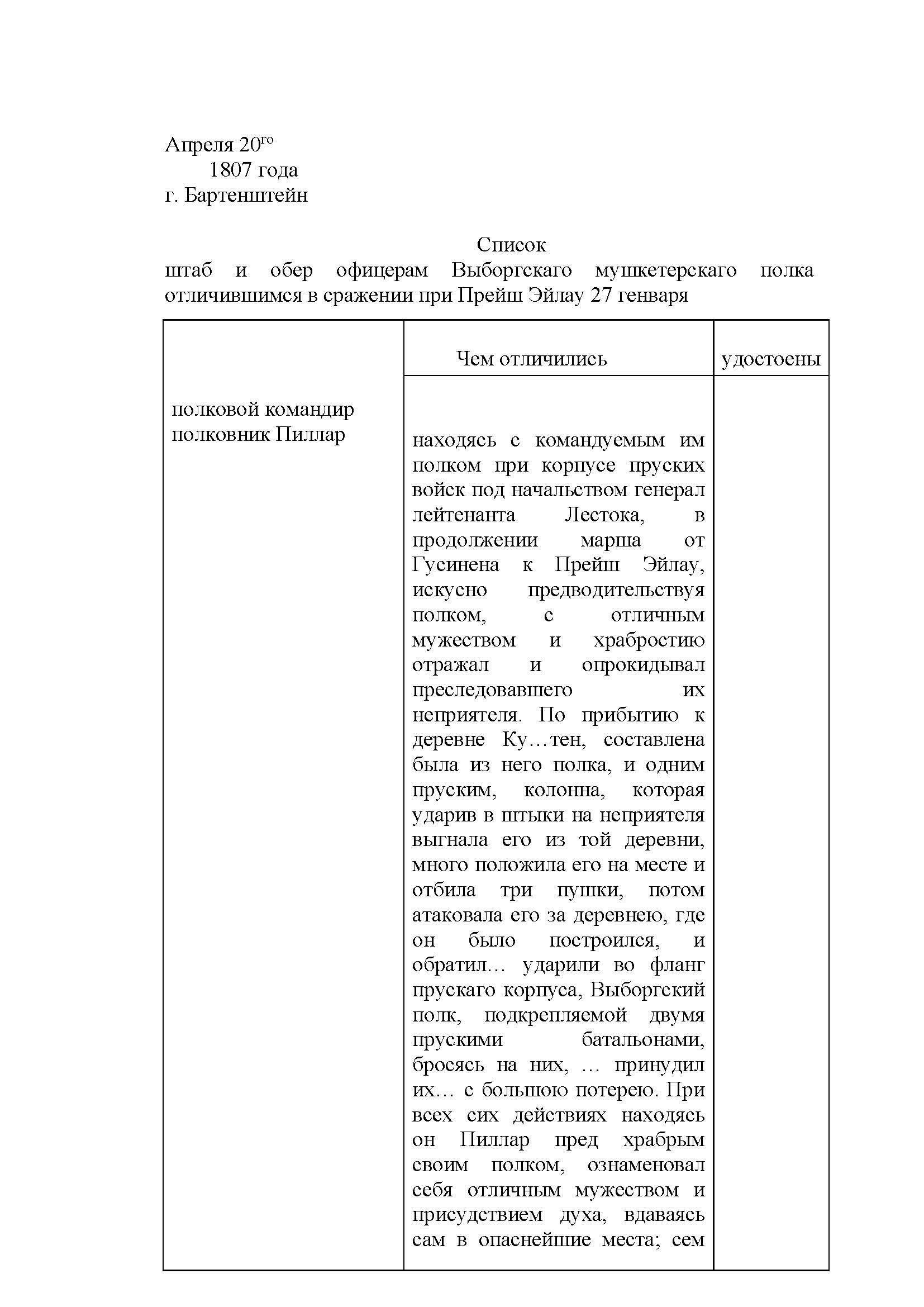 Командующий корпусом пруских войск генерал лейтенант Лесток особенно похваляя подвиги некоторых штаб и обер офицеров Выборгскаго мушкетерскаго полка, находящегося под его начальством, представил мне оный список, с означением, чем кто из них в генеральном сражении при Прейш Эйлау отличился. Я долгом сие поставляю список сей представить Вашему ИМПЕРАТОРСКАМУ ВЕЛИЧЕСТВУ и всеподданнейше прошу ощастливить офицеров сих. Я за оказанные им подвиги ВЫСОЧАЙШЕЮ ВАШЕГО ИМПЕРАТОРСКАГО ВЕЛИЧЕСТВА Милостью.