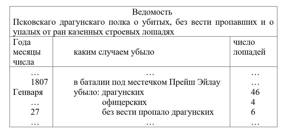 О убитых без вести пропавших в сражениях, и о упалых от ран препорученнаго командованию Псковскаго драгунскаго полка казенных строевых и офицерских лошадях ведомость, с означением когда сколько, и от чего убыло; - при сем вашему Сиятельству честь имею представить.